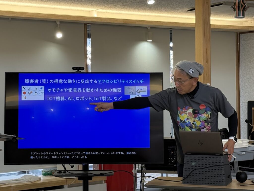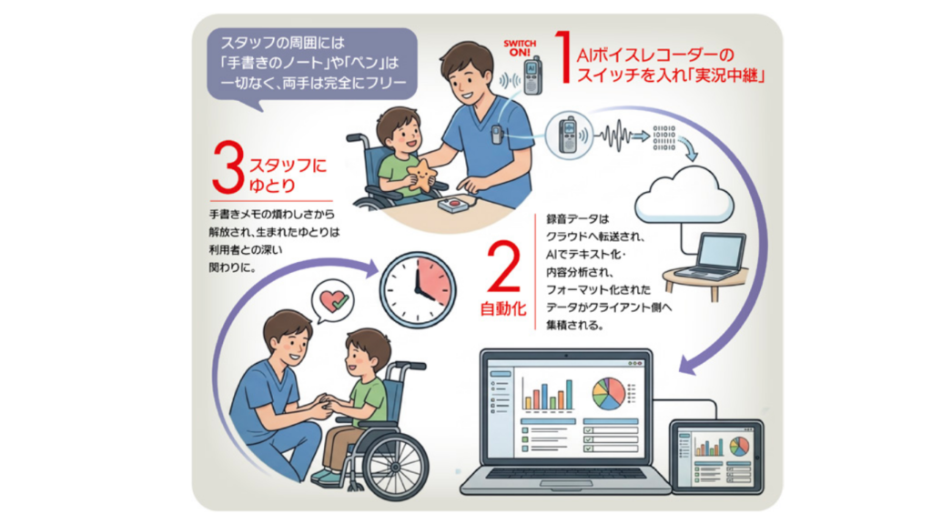 現場で重視したのは、学びを「特別な訓練」として切り離すのではなく、日中活動の中に無理なく組み込むことでした。そのために、機材を常設してすぐに活動を始められる「生涯学習ラボ」を整備し、利用者本人の「今、やりたい」というタイミングを逃さない環境づくりを進めました。また、iPadと視線入力装置「Hiru」(目の動きで操作する機器)を活用した支援モデルの検証や、AIボイスレコーダーを用いた支援記録のDX化(デジタル技術を活用した業務改善)にも取り組み、忙しい現場でも実装しやすい仕組みを整えました。